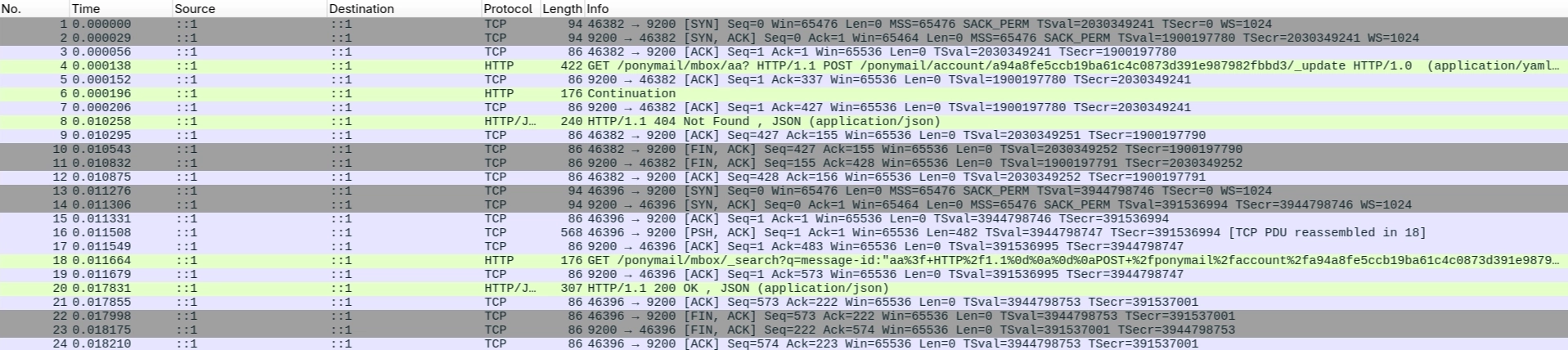 In Packet 4, Apache writes the smuggled payload as three HTTP requests sent in a single byte stream. Packet 6 contains the remainder of the YAML body. Packet 8 shows Elasticsearch’s 404 response to the first GET. The connection then closes with FIN packets.