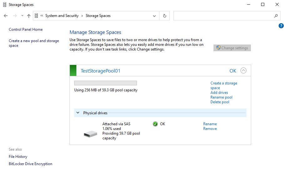 During our research, we noticed that the operations on storage space are handled by the program SpaceAgent.exe, this program will create IOCTL requests to the spaceport.sys driver for processing (It can be said that the spaceport.sys driver will process all requests from SpaceAgent.exe). Operations can be seen on the interface of SpaceAgent.exe, such as creating Pool, creating Storage Space, renaming Pool, deleting Pool, etc. Figure 1 below is an example of GUI of storage space with 1 Pool with the name " TestStoragePool01" has a size of 60GB