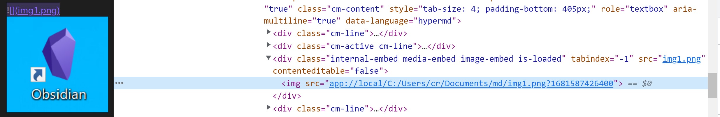 In resources/app.asar/main.js, a custom URL scheme app:// is registered via electron.protocol.registerFileProtocol API. This URL scheme is designed for loading local resources embedded in the markdown file. For example, an image in markdown syntax  will be converted to HTML img tag <img src="app://local/C:/Users/cr/Documents/md/img1.png?1681587426400"> for preview: