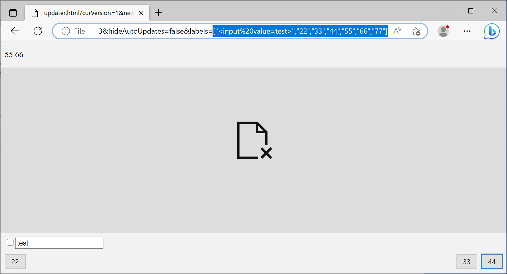 updater.html?curVersion=1&newVersion=2&releaseNoteLink=3&hideAutoUpdates=false&labels=["<input%20value=test>","22","33","44","55","66","77"]