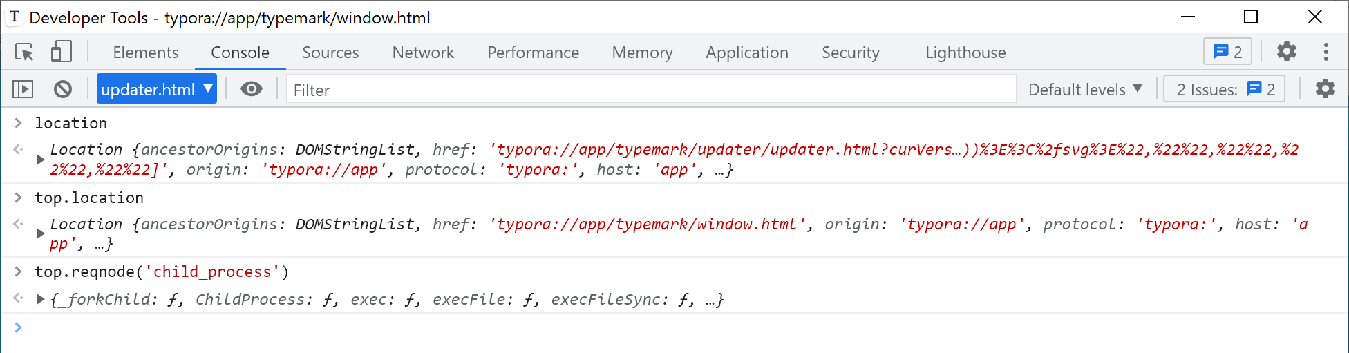 It is possible for attacker to load the vulnerable updater.html inside an <embed> tag by setting the src attribute to typora://app/typemark/updater/updater.html. In this case, typora://app/typemark/window.html loaded in the main window, and the embedded updater page, are considered same-origin. Thus, updater is able to access privileged interfaces exposed to the main window, such as reqnode.