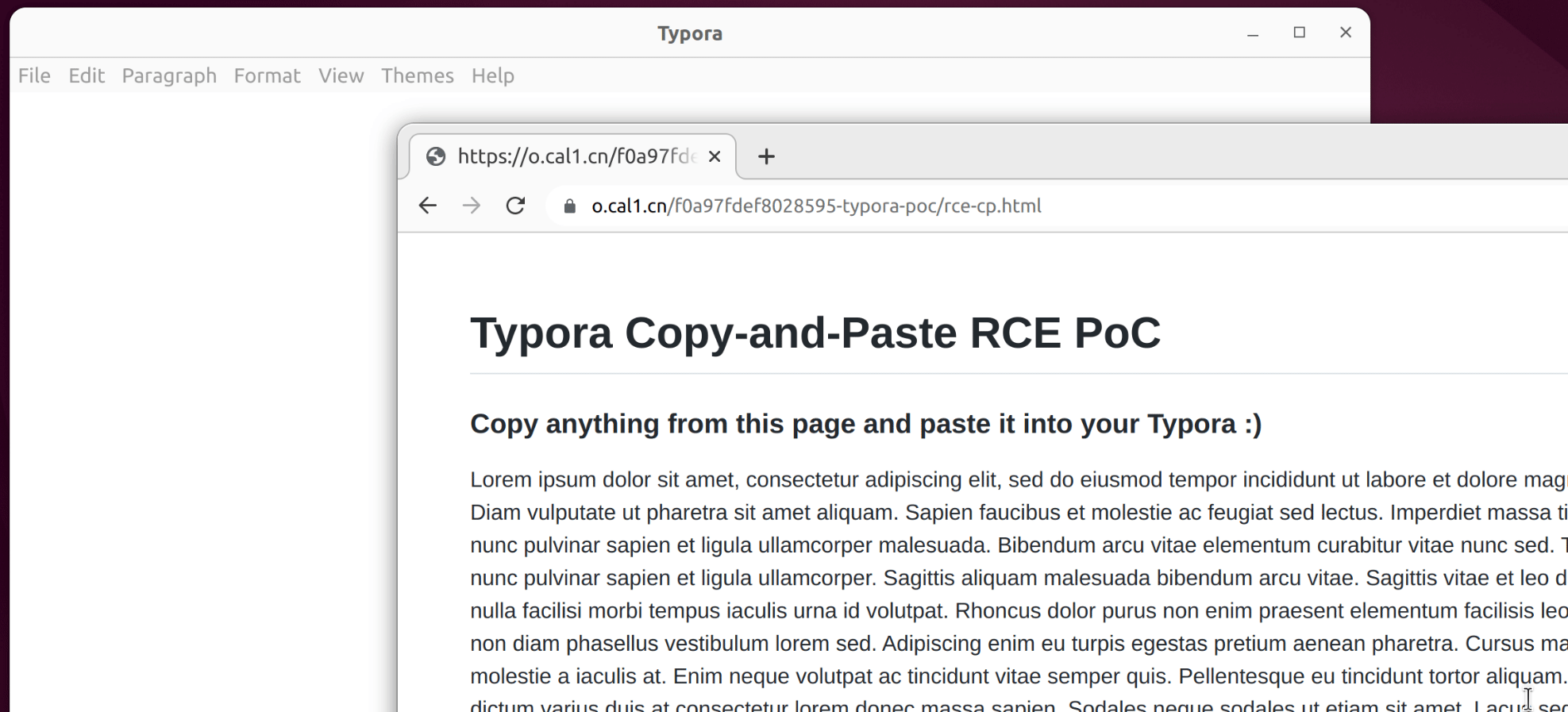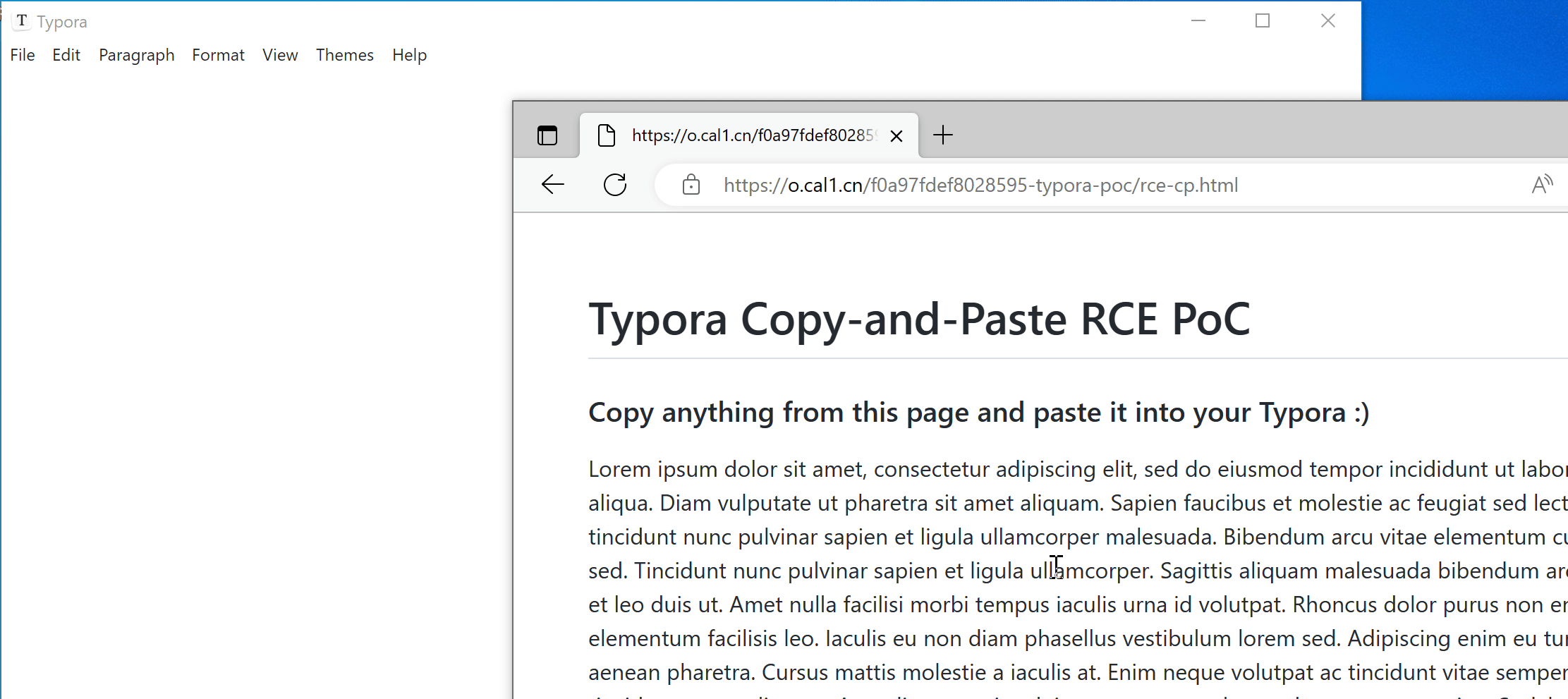 When the victim copies text from this page, the payload is added to the copied content and will be triggered when it is pasted into Typora.