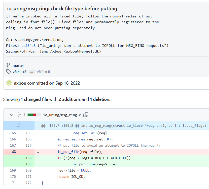 Ordinarily, the message passing functionality of io_uring expects a file descriptor corresponding to another io_uring instance. If we pass in a reference to anything else, it’s simply dropped with a call to io_put_file() and an error is returned.