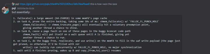 After I spent a few attempts experimenting with various ideas which didn’t work too well, Billy suggested adapting this method to significantly increase the delay created by a page fault (image from Google CTF discord):