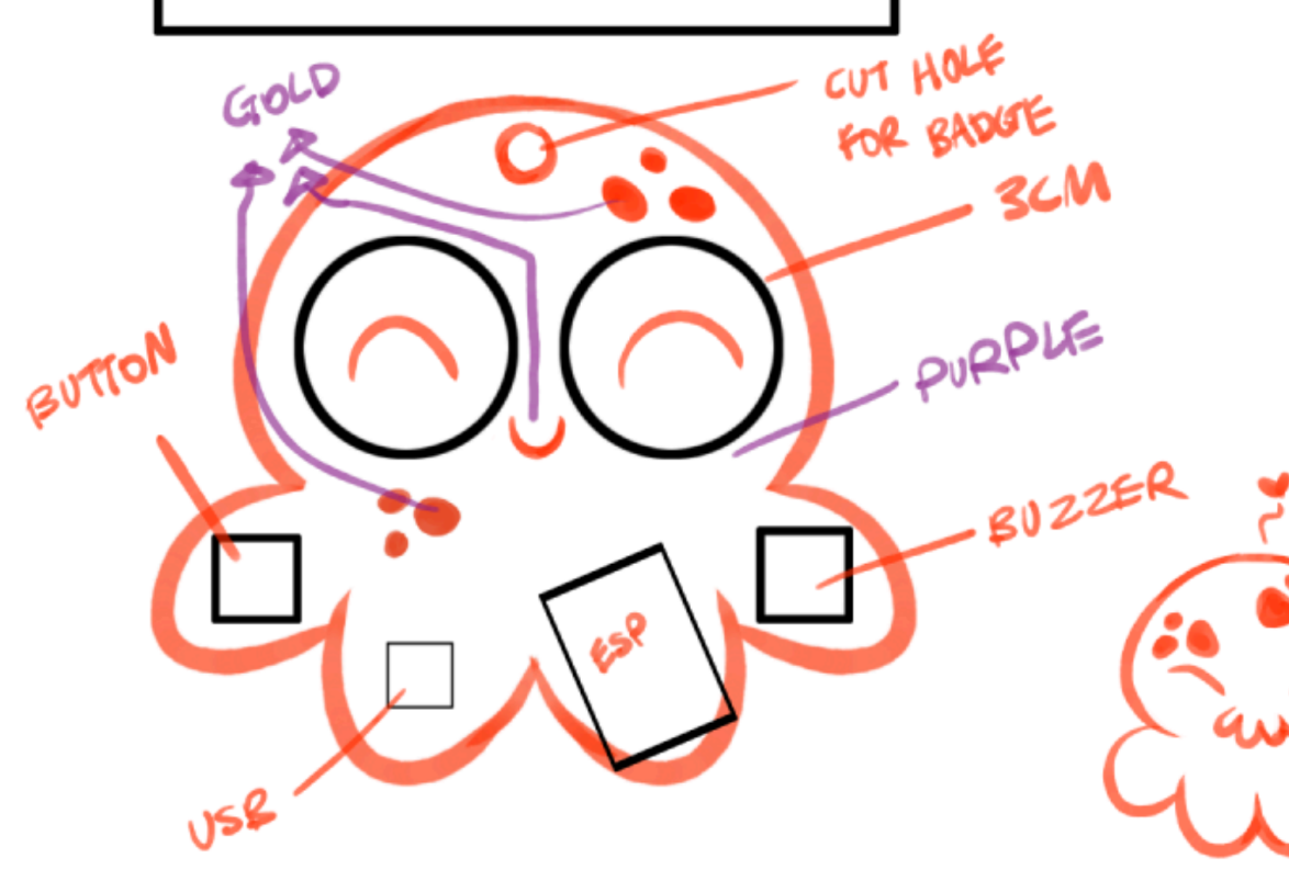 The artwork was designed by Sarah Tan and features an adorable octopus with googly eyes. After brainstorming various designs, we decided to incorporate two separate round displays for the eyes. Here is one of the sketches from the early prototypes: