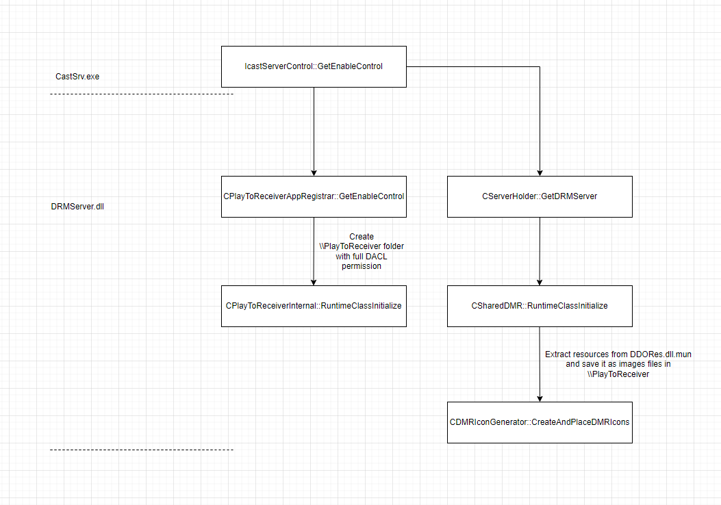 The underlying call of functions in IcastServerControl::GetEnableControl that create \\PlayToReceiver with full DACL permission, and drop image files are simplified in below Control Flow Graph. I will describe more details on this later in Exploitation.