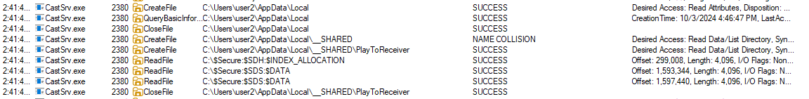 Note that this is the first time we are calling the ICastServerControl->GetEnableControl method. However, since CastSrv.exe is now running under another user context, we have already created the folder PlayToReceiver in the \user02\AppData\Local\__SHARED\PlayToReceiver directory.