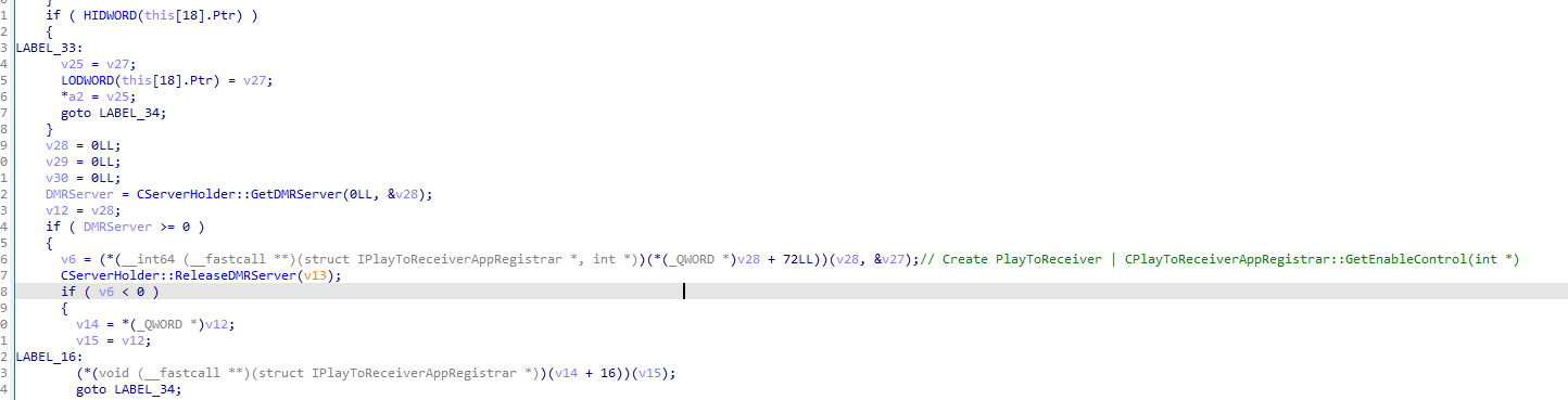 When invoked, CCastServerControl::GetEnableControl initiates a call to CServerHolder::GetDMRServer and subsequently to IPlayToReceiverAppRegistrar+72, which corresponds to CPlayToReceiverAppRegistrar::GetEnableControl via its virtual table in DMRServer.dll.