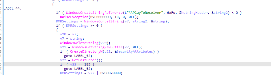 Within DMRServer.dll, these calls trigger the initialization of the CSharedDMR and CPlayToReceiverInternal classes. The initialization of the CSharedDMR class results in the creation of several image files, which will be discussed in further detail later. Meanwhile, the CPlayToReceiverInternal::RuntimeClassInitialize method creates the PlayToReceiver folder within the %AppData% directory. Notably, this process does not include a check for symbolic links.