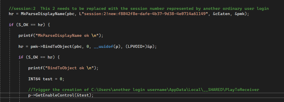 Since we are already running CastSrv.exe for the user02 session 2 from Step 1, we will now call BindToObject to obtain a pointer to the ICastServerControl interface and then trigger the ICastServerControl->GetEnableControl method from there.