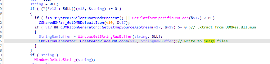 The creation of these image files is initiated during the initialization of the CSharedDMR class. Specifically, when CSharedDMR::RuntimeClassInitialize is invoked, it extracts icons from DDORes.dll.mun and subsequently writes them to the aforementioned image files.