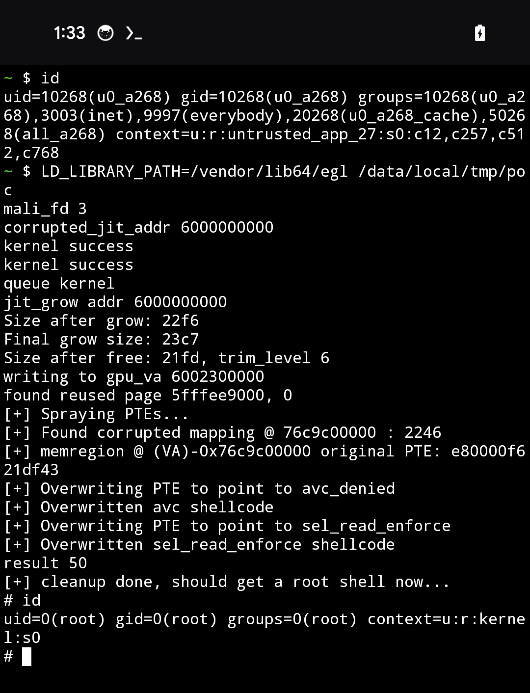 The original exploit reuses the freed page by spraying Mali GPU’s PGDs. Since we are able to read and write access to the freed page, we are able to control a PTE within the newly allocated PGD. This allows us to change the backing page of our reserved buffer to point to any memory region, and subsequently use it to modify kernel functions.